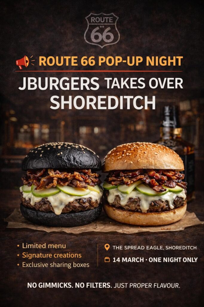 14 March · Shoreditch Something bold is landing in Shoreditch. On 14 March, JBurgers takes over The Spread Eagle for a one-night pop-up experience , bringing Route 66 flavour, Jack Daniel’s glazed signatures and our premium sharing boxes to the heart of East London. Expect: This isn’t a soft launch.It’s a statement. 📍 Spread Eagle, … Continued