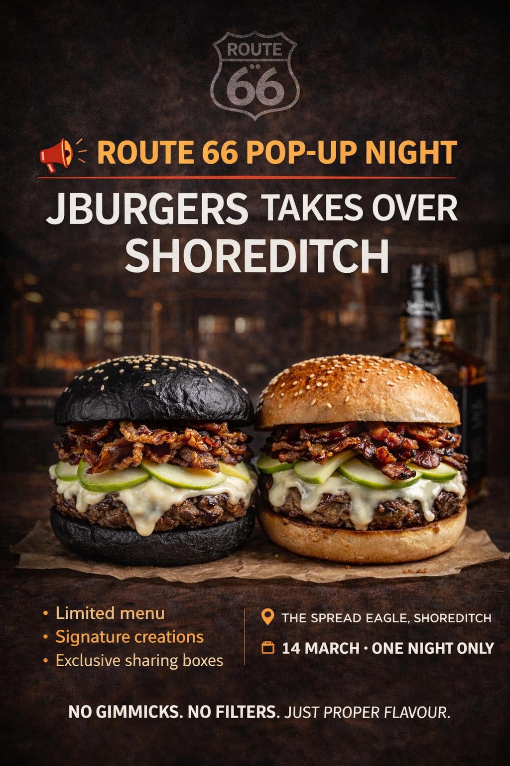 On 14 March, JBurgers takes over The Spread Eagle for a one-night pop-up experience , bringing Route 66 flavour, Jack Daniel’s glazed signatures and our premium sharing boxes to the heart of East London.
