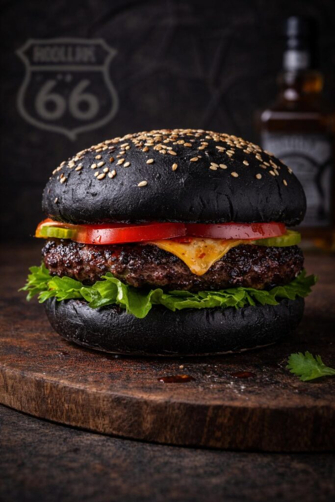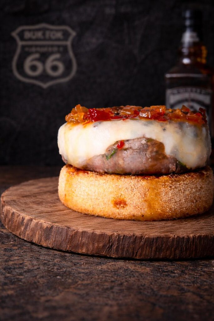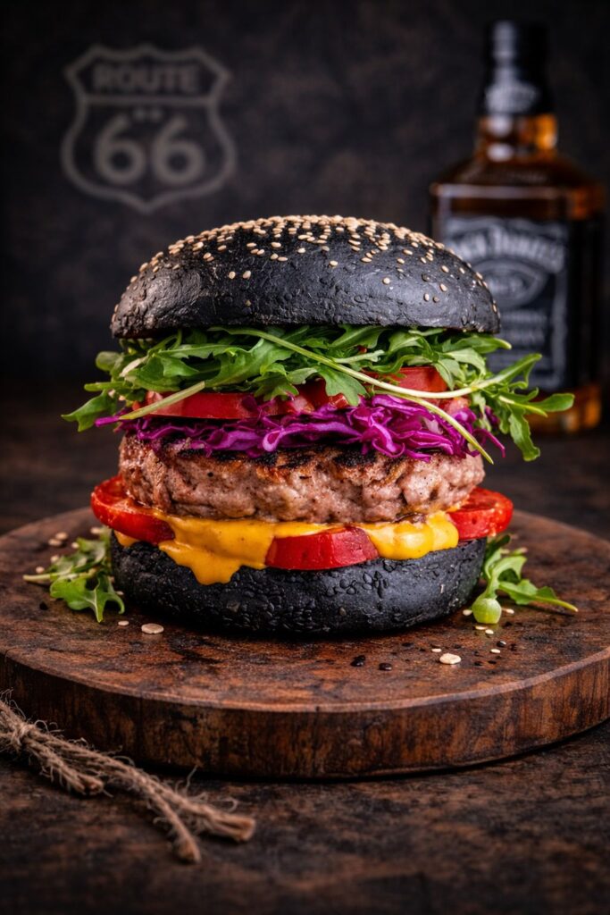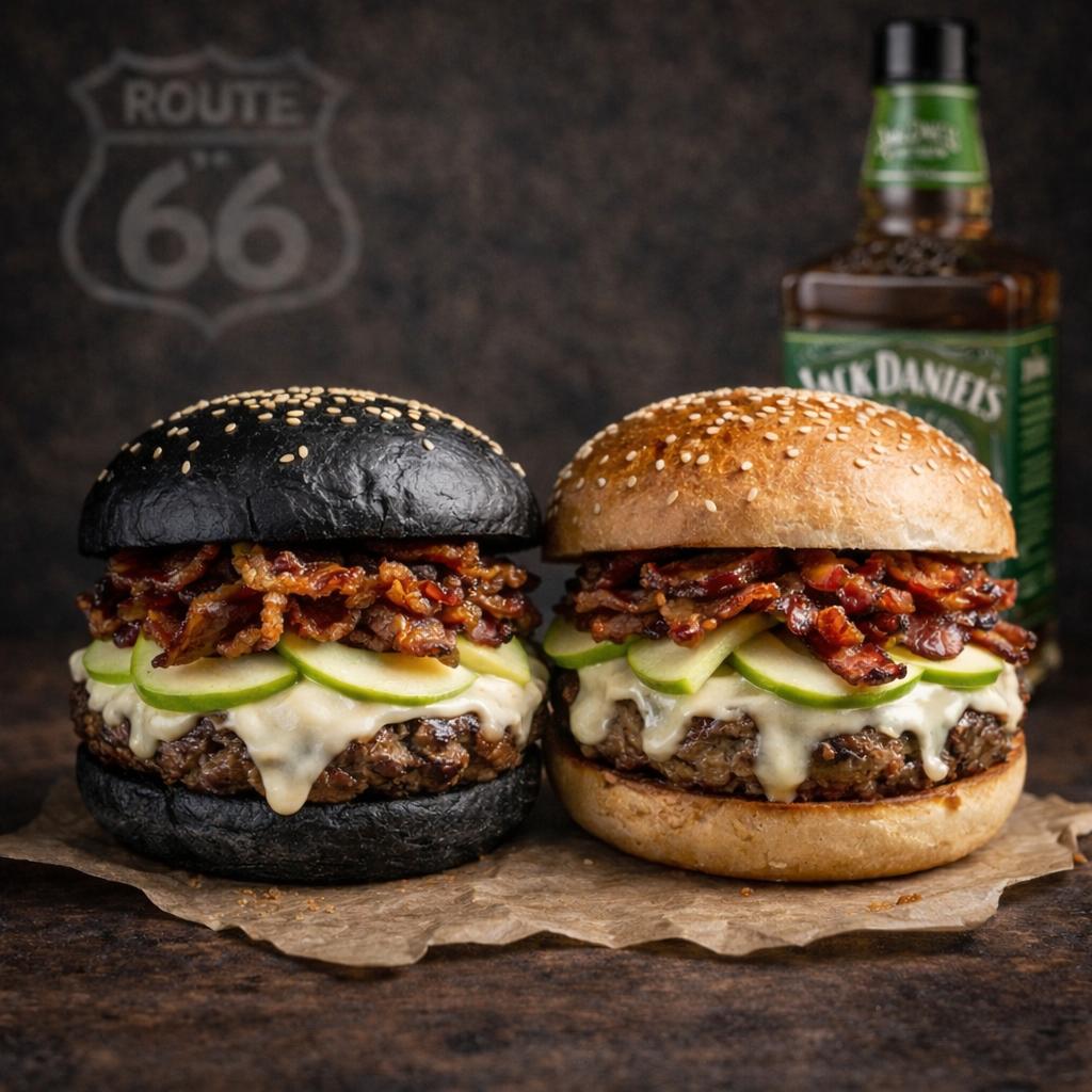 A tribute to the smoky soul of Missouri. Slow-smoked beef brisket slices, layered over a flame-seared beef patty and crowned with melted cheese. Finished with grilled onions and fresh herbs, all served in a toasted black sesame bun. Deeply smoky. Boldly American. A true Smokehouse classic on Route 66.
