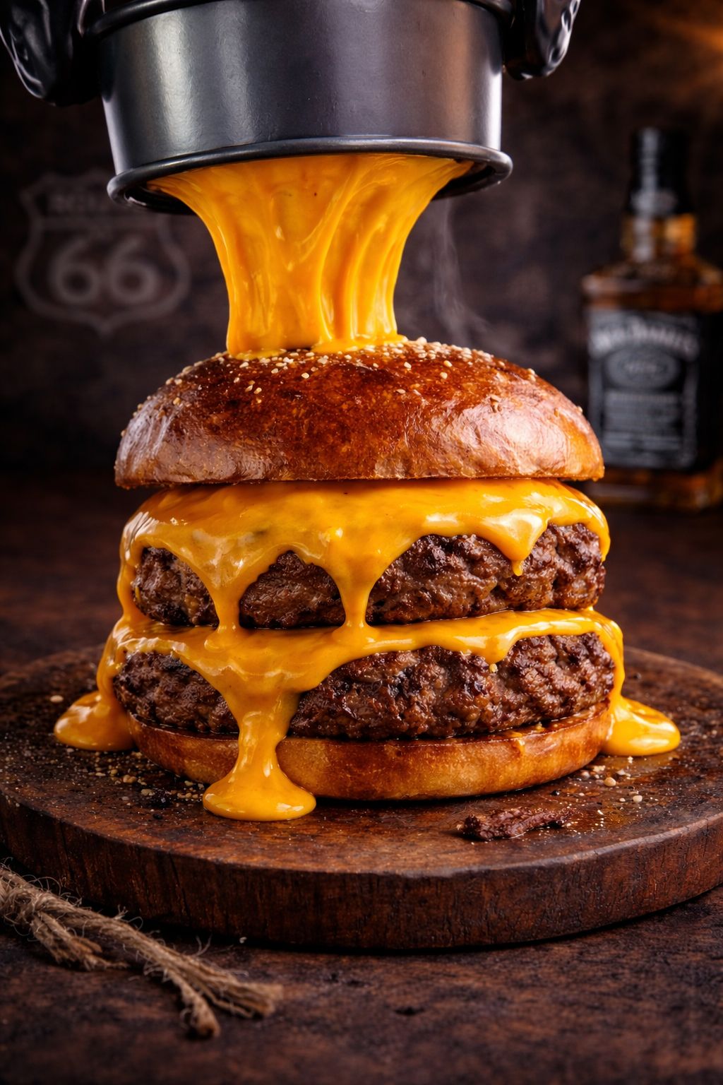Two 120g smashed beef patties, stacked West Coast style, layered with double melted American cheese.