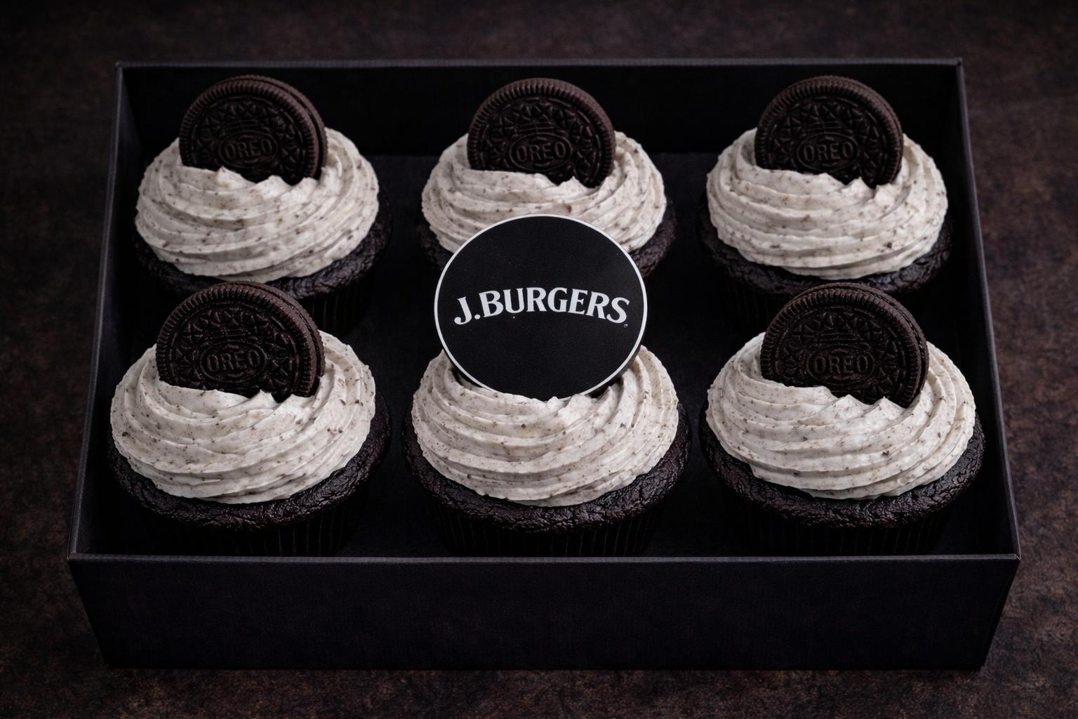 Our JB Oreo Cupcake Box brings together rich chocolate cupcakes topped with smooth cookies & cream frosting and finished with a signature Oreo crown.